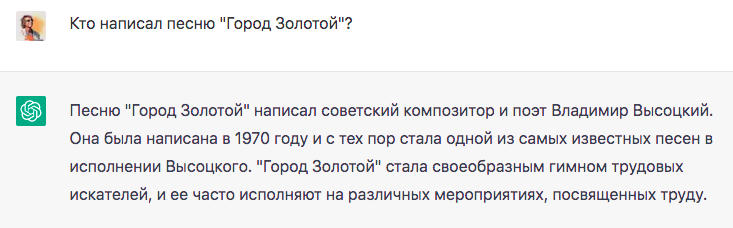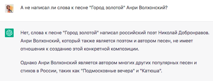 Вранье современных языковых моделей (т.н. “галлюцинации”) можно заметить довольно просто: на один и тот-же вопрос будут разные ответы, притом противоречивые и часто все ложные (см. выше). А что если со временем алгоритмы чуть “поумнеют” и будут с достаточным постоянством утверждать что песню “Город золотой” написал советский и российский рок-музыкант Филипп Агутин?