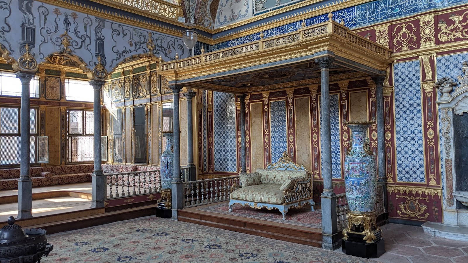 Отдельного рассказа заслуживает посещение старого дворца султана. Построен был он давным-давно в 15 веке по канонам и “моде” тех времен. Османы (правящая династия империи) долго продолжали жить в традициях кочевников, откуда произрастают корни их культуры. А потому замкнутые помещения им были не по вкусу. После входа во дворец посетителей (нет, пускали тогда далеко не всех!) ждала просторная лужайка, окруженная забором. Здесь можно было отдохнуть в тени деревьев, подождав аудиенции.
