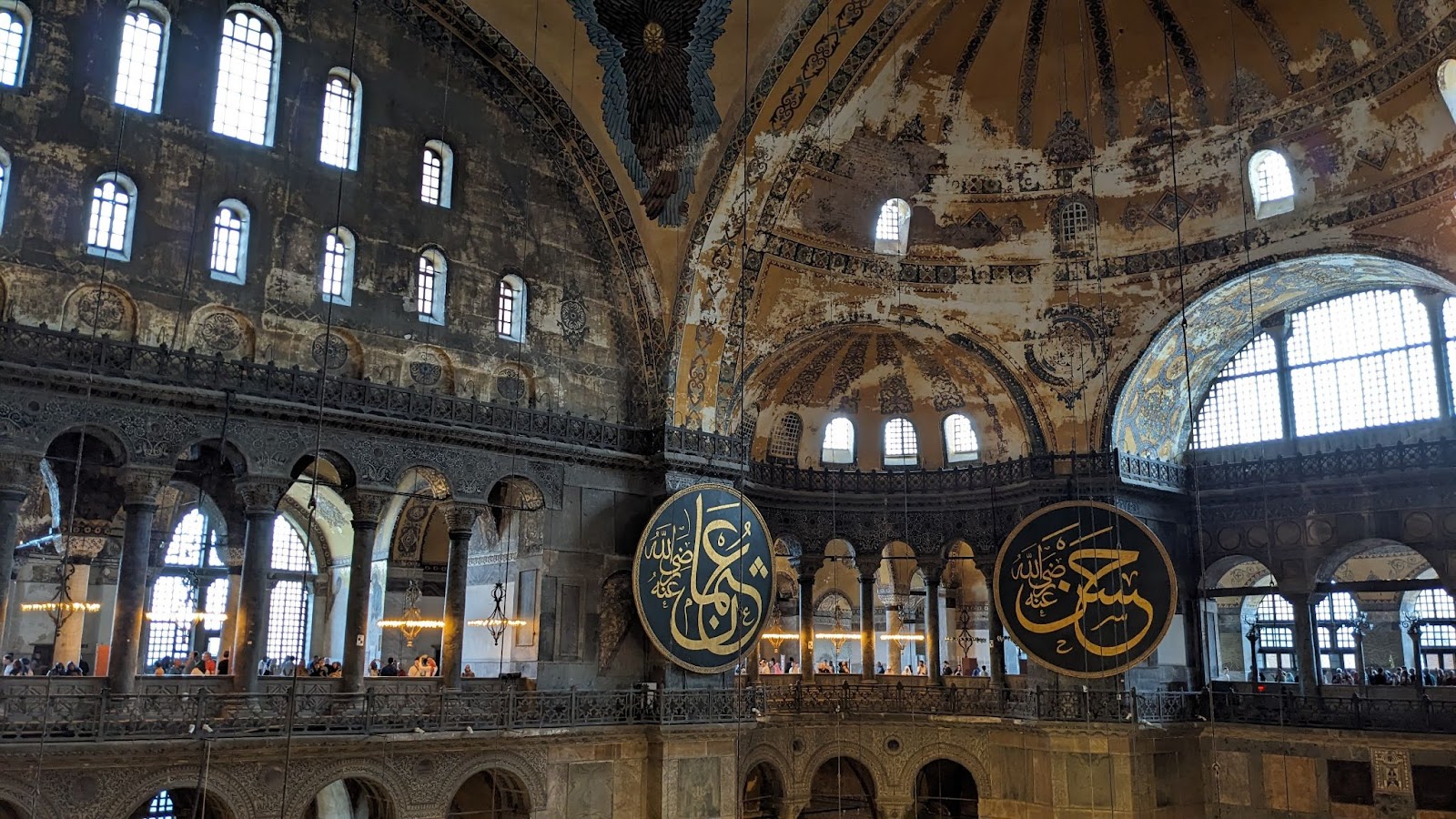 Однако, величия куда больше внутри. Это один большой и просторный зал и 2 этажа для посетителей. Первый для тех, кто верит в Аллаха (это такой местный бог) а второй для всех остальных. На потолке и стенах сохранились остатки иконописи ранне-христианского периода. На стенах и столбах — надписи арабской вязью, выдержки из главной книги этого Аллаха под названием Коран. Прямое и вполне буквальное отражение истории.