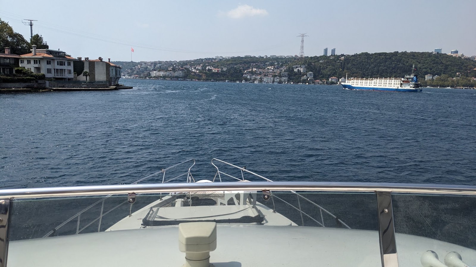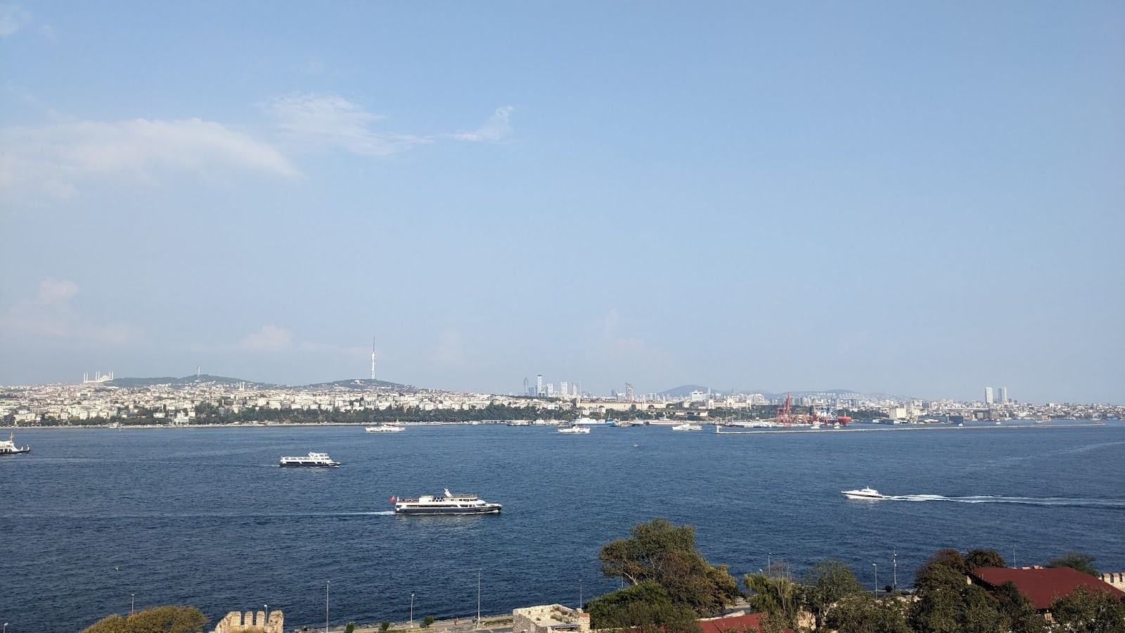 Сотни громадных танкеров и прочих кораблей проходят через Босфор ежедневно. Движение такое интенсивное что приходится ограничивать направление либо “туда” либо “обратно” в зависимости от времени суток. Безупречно чистая вода какого-то необычного (не как в Калифорнии и Флориде) цвета. Немного похоже на Гибралтар в отличие от него Босфор куда уже — всего 750 метров в самом горлышке.