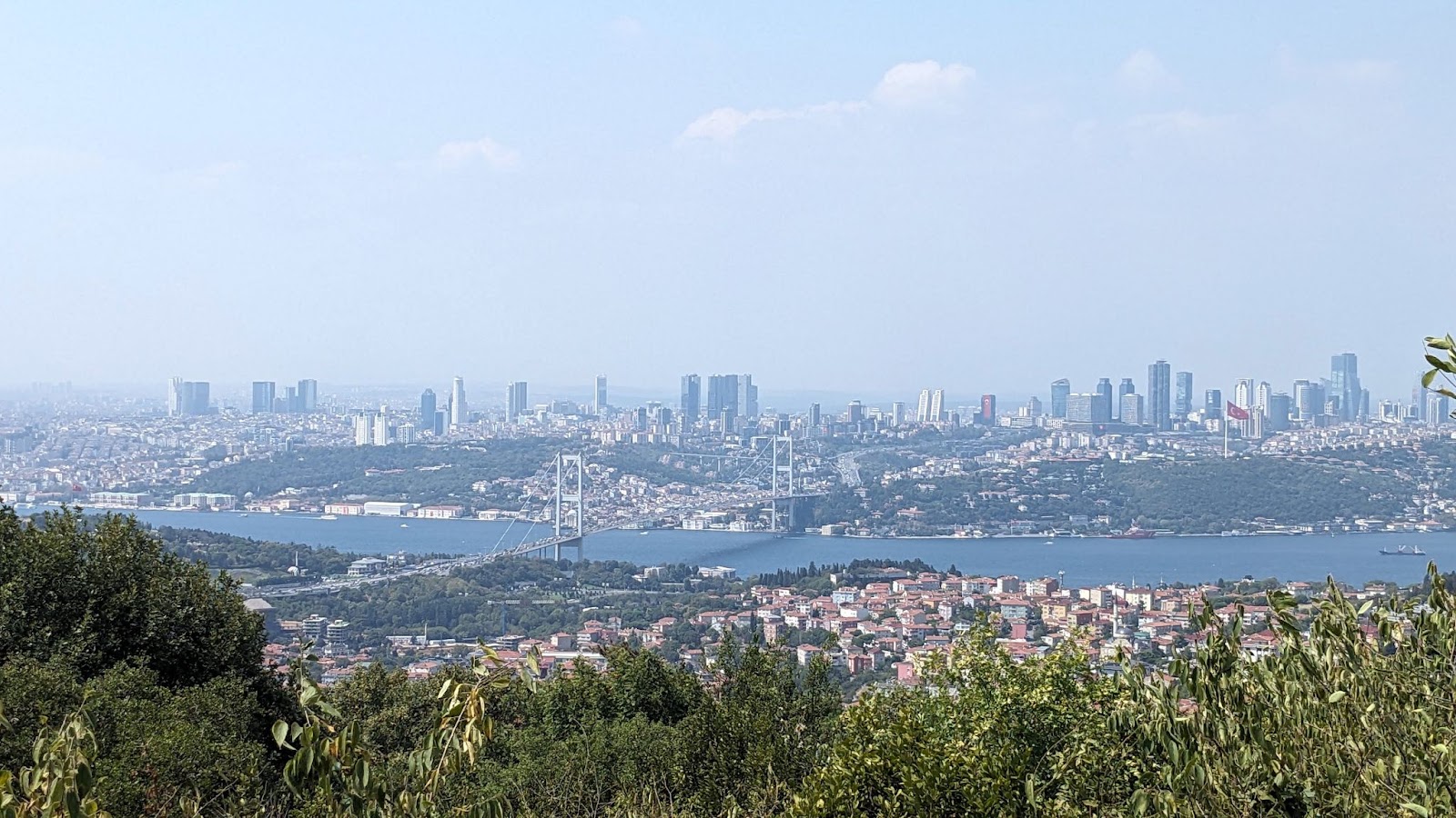 Местность тут не то чтобы горная, но холмистая. Переехав ненадолго в Азию (вот так вот запросто!) и забравшись на местных “холм обозрения” нашему взору предстал вид современного города (это там, в Европе!), мост и сам пролив — вовсе неширокий издалека. Правда в воздухе была дымка и мелкие детали на горизонте не разглядеть. Но масштаб и пространство от края до края увидеть можно. Конечно никакая фотография не передает реально увиденного.