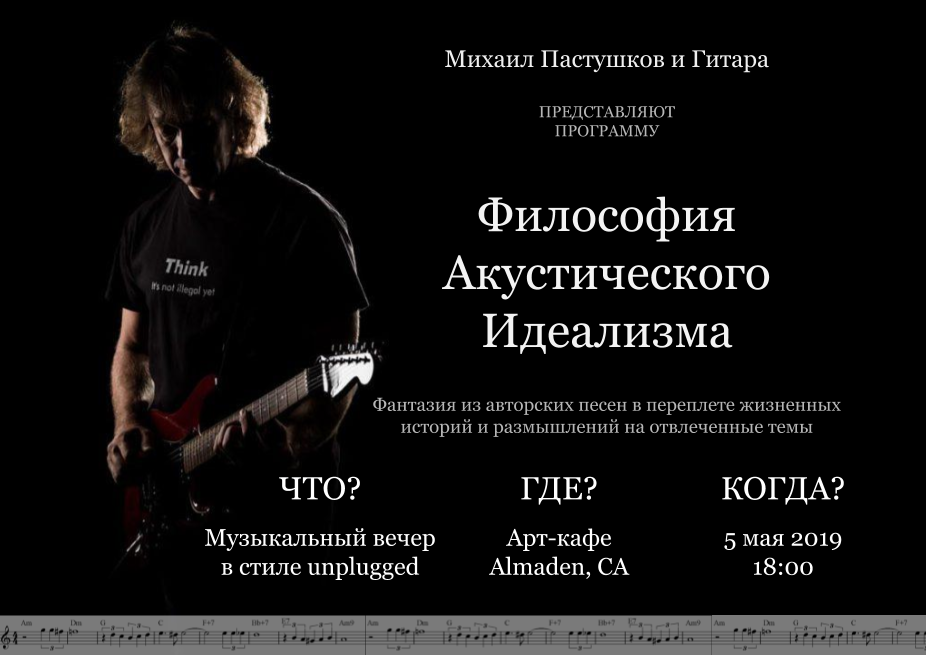 Но чтобы выступать, надо группу музыкантов. Или нет? А может и нет .. и вот он по советам товарищей по оружию составил первую собственную программу “Философия акустического идеализма” где только гитара, голос да парочка эффектов для придания обьема. Ничего в записи, только живая музыка. А между песнями небольшие словесные вкрапления, связывающие все происходящее в некую историю с картинками.
