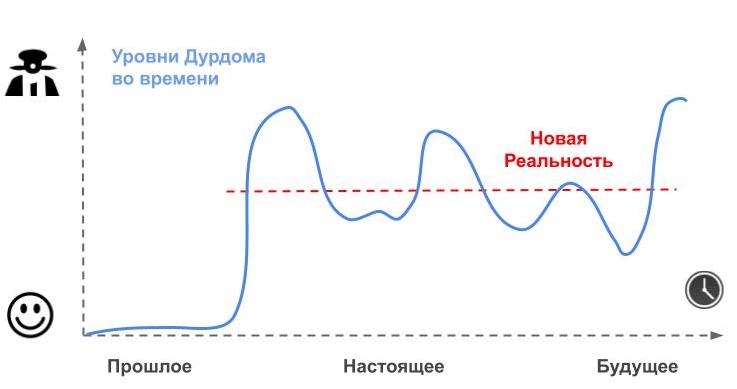 Общий уровень абсурдности происходящего, существенно возросший в последние полтора года, будет иметь циклических характер с периодом обращения около года. В ближайшее десятилетие среднеквадратичное значение “Дурдома” (помеченное на графике как Новая Реальность) существенно не уменьшится. Хочется верить, что красная пунктирная линия по крайней мере не поползет вверх. До прежних уровне она уже не опустится никогда.
